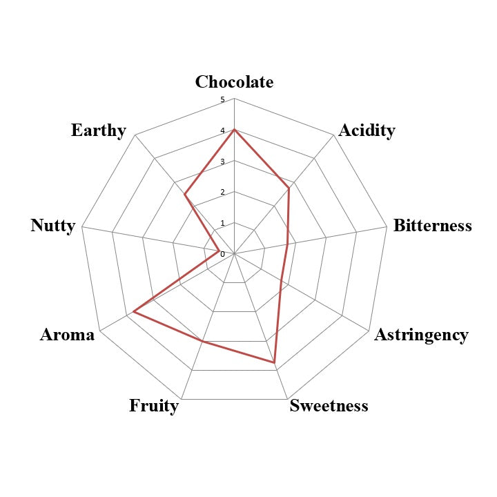 The flavors as a brewed cocoa are more bold than some of the other varieties I carry. The dry aroma is unmistakably chocolate and this of course carries through with the wet aroma. There are flavors of nut and tobacco and a substantial mouth feel. There is a good, balanced, pleasant bitterness and lingering deep (for a brewed cocoa) chocolate. It also has a good smoothness to it. Overall, I am left with the impression that I have just eaten a nice handful of luscious roasted cocoa beans.